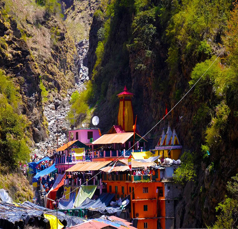 Yamunotri at the source of river Yamuna. Atop is a flank of Bandar Poonch peak (3615 meters). The actual source, a frozen lake of ice and glacier (Champasar Glacier) located on the Kalind Mountain at the height of 4421 m above sea level is about 1 km further up is not easily accessible. Hence the shrine has been located on the foot of the hill. The Temple of divine mother Yamuna was built by Maharaja Pratap Shah of Tehri Garhwal. The tiny Yamuna has icy cold water and its absolute innocence and the infantile purity heightens that deep feeling of reverence, which Yamunotri has for the devout. According to the legend ancient sage Asit Muni had his hermitage here. The trek to Yamunotri is truly spectacular, dominated by a panorama of rugged peaks and dense forests.The deity or Goddess Yamuna is made of black marble. The temple is dedicated to the river Yamuna, who is represented in the form of a silver idol, bedecked with garlands.Close to the temple are hot water springs gushing out from the mountain cavities. Suryakund is the most important Kund. Near the Suryakund there is a shila called Divya Shila, which is worshipped before puja is offered to the deity. Pilgrims prepare rice and potatoes to offer at the shrine by dipping them in these hot water springs, tied in muslin cloth. Rice so cooked is taken back home as prasadam.The pujaris and priests who perform in Yamunotri temple come from the village of Kharsali near Jankichatti.